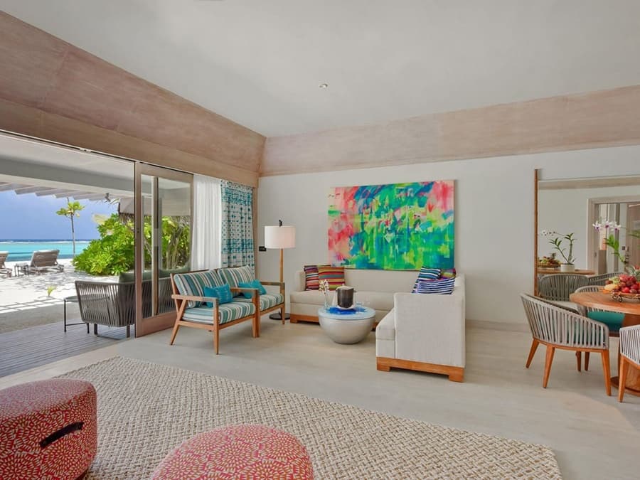 房型介绍:豪华沙滩别墅提(双卧)只有一间,位于岛屿东面水屋入口附近。别墅面积270平米,不带私人泳池,有两个卧室和独立的客厅,是家庭和小团体的理想选择。私人花园区配有阳台和休息室,可到达海滩和潟湖,面对宁静的马尔代夫日出。独立、宽敞的浴室通过露天淋浴与室外相连,并配备最新的豪华设施。