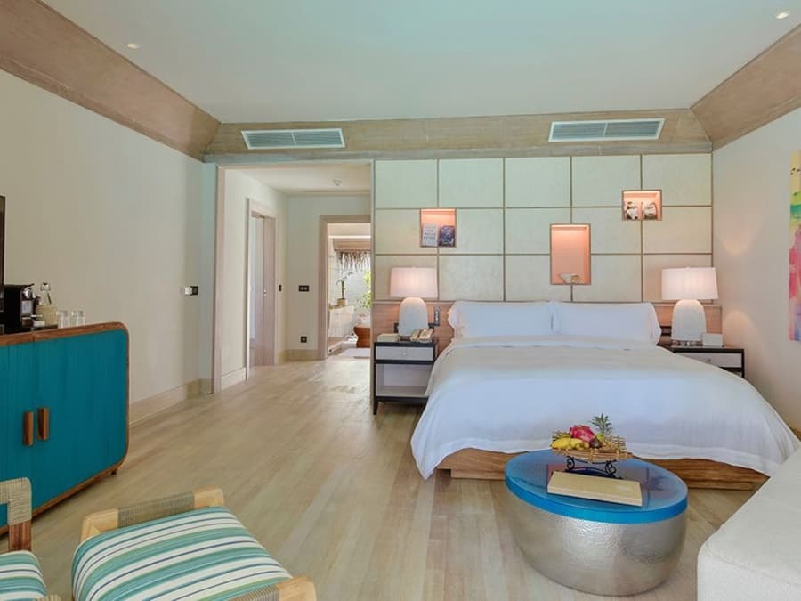 房型介绍:水上别墅总共只有18间,位于岛屿东面,房间面积140平米,不带私人泳池,有网床等设施,最多可入住2大2小或者3个大人,通过木质走道与主岛相连。别墅的私人阳台延伸到吊床上,你可以在这里晒日光浴,聆听海浪的声音,看各种海洋生物。可以从房间楼梯直接下海,别墅还有一个宽敞的浴室和室外与露天浴缸。