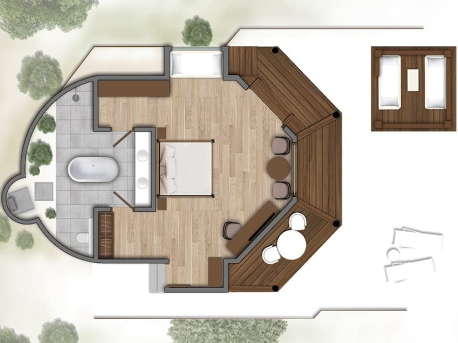 房型介绍:岛上最基础的房型,位于岛内,不面向大海。房间面积55平米,最多可入住2大2小,不带私人泳池。别墅包括一个宽敞的卧室区,配有特大号床和独立的浴室。室外有一个区域,你可以坐在外面,欣赏度假村周围郁郁葱葱的热带风光。